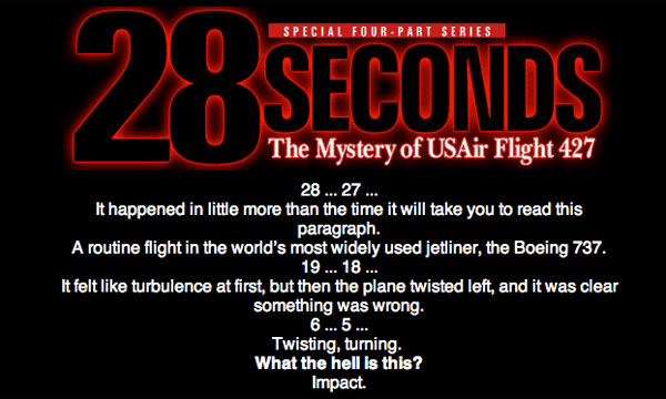 28... 27... It happened in little more than the time it will take you to read this paragraph. A routine flight in the world’s most widely used jetliner, the Boeing 737. 19... 18... It felt like turbulence at first, but then the plane twisted left, and it was clear something was wrong. 6... 5... Twisting, turning. What the hell is this? Impact. View story