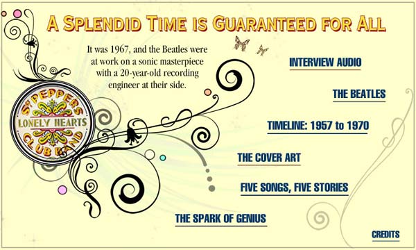 A look back at the making of Beatles' Sgt. Pepper with sound engineer Geoff Emerick by Christopher Ave. I created a 1960s influenced design and an interactive graphic identifying every person and object on the Sgt. Pepper's album cover. View story